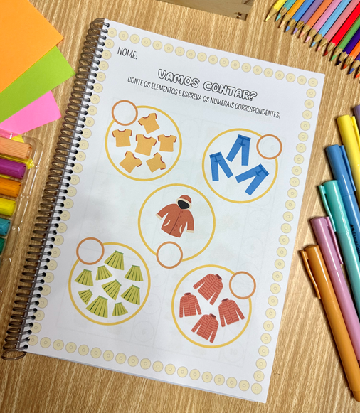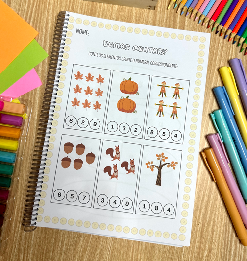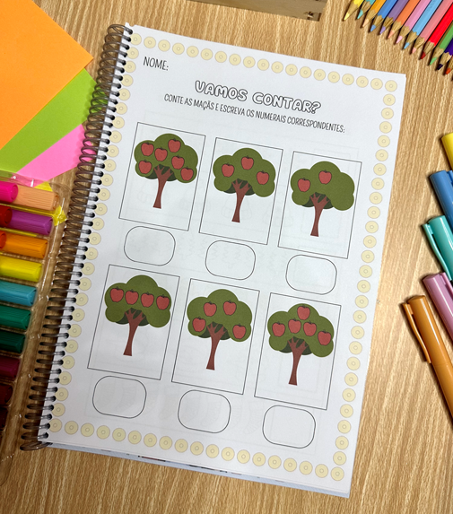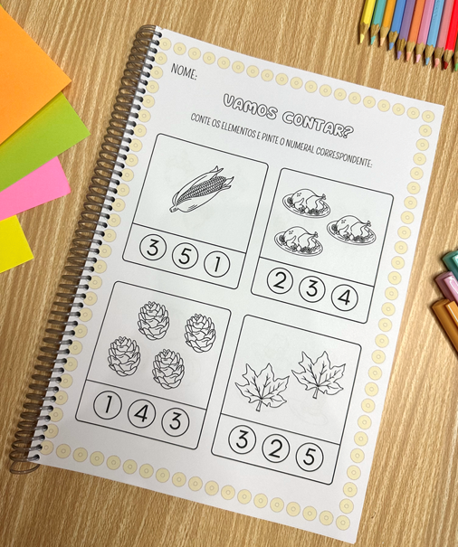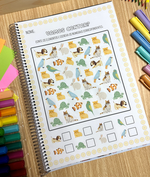 A apostila possui mais de 60 páginas de atividades para trabalhar contagem com crianças a partir de 4 anos.