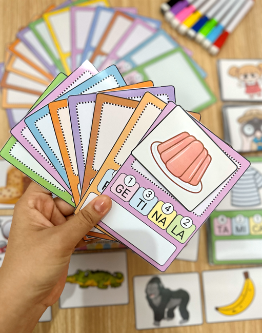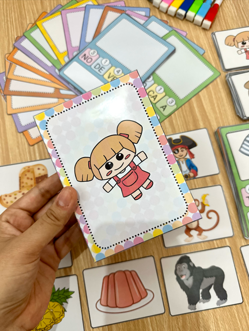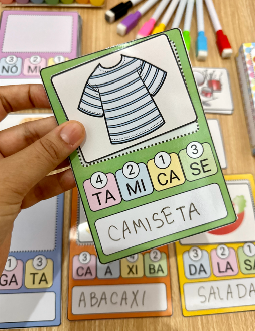 Arquivo com 48 fichas de palavras para a criança organizar as sílabas e descobrir qual figura a palavra representa.