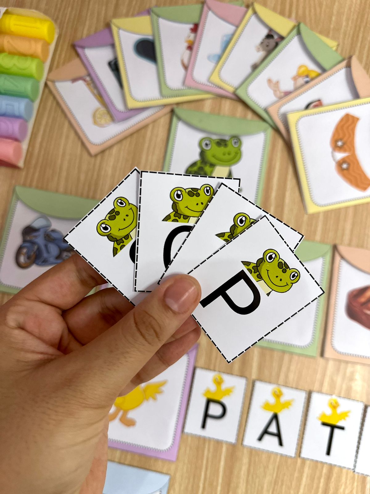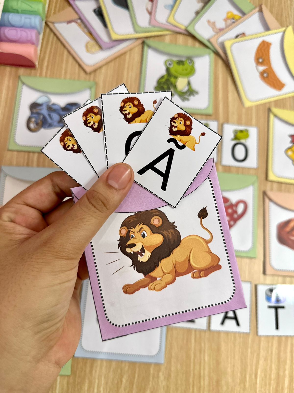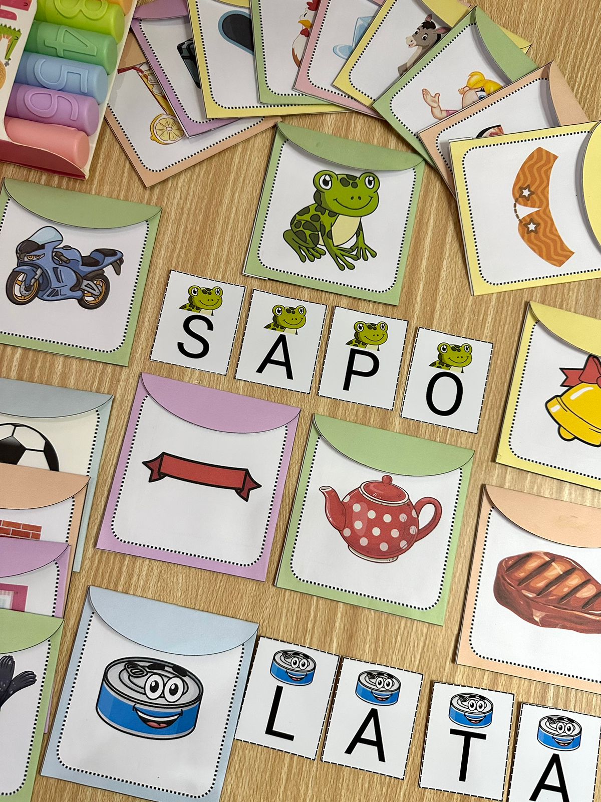 A proposta do recurso é trabalhar com letras de forma organizada e direcionada, facilitando a compreensão e organização das letras para formar as palavras. Cada palavra possui um envelope e as letras móveis já selecionadas, então a criança irá ter mais facilidade no momento da atividade.