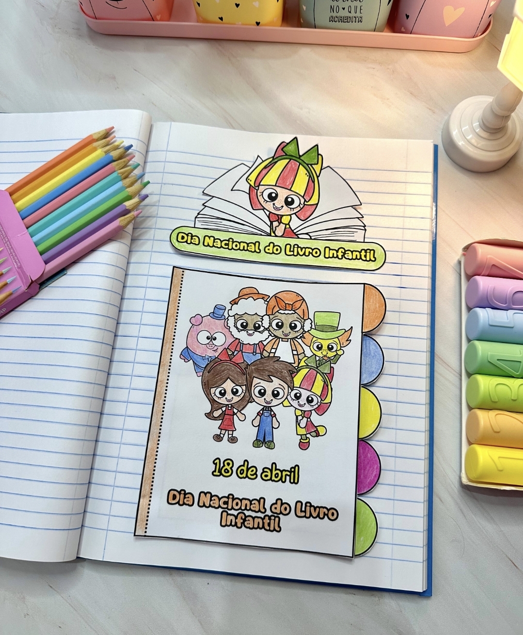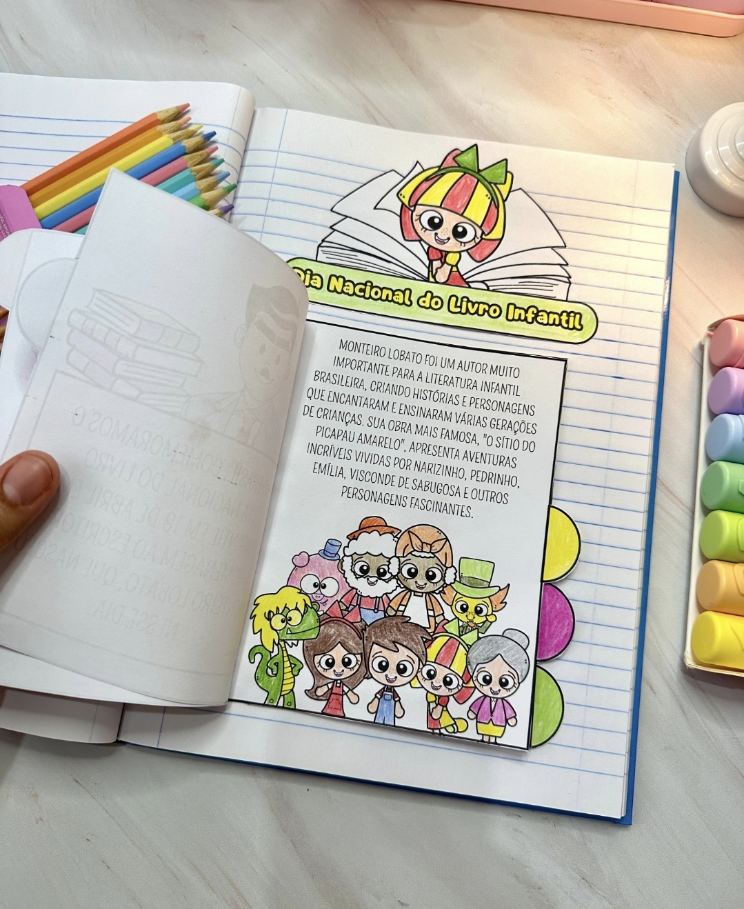 Atividade interativa em formato de livro para trabalhar o Dia Nacional do Livro Infantil com crianças de educação infantil e das séries iniciais do ensino fundamental.