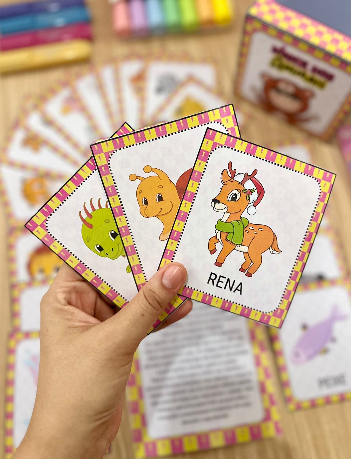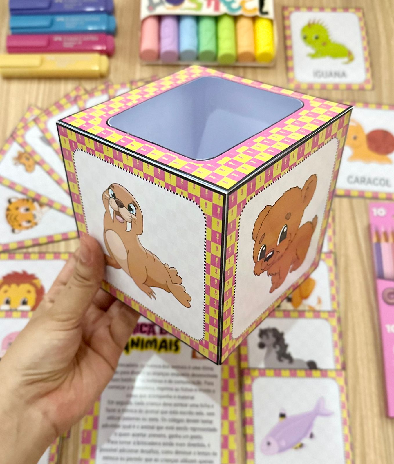 O material também acompanha instruções de uso e uma caixinha para utilizar no momento da brincadeira.