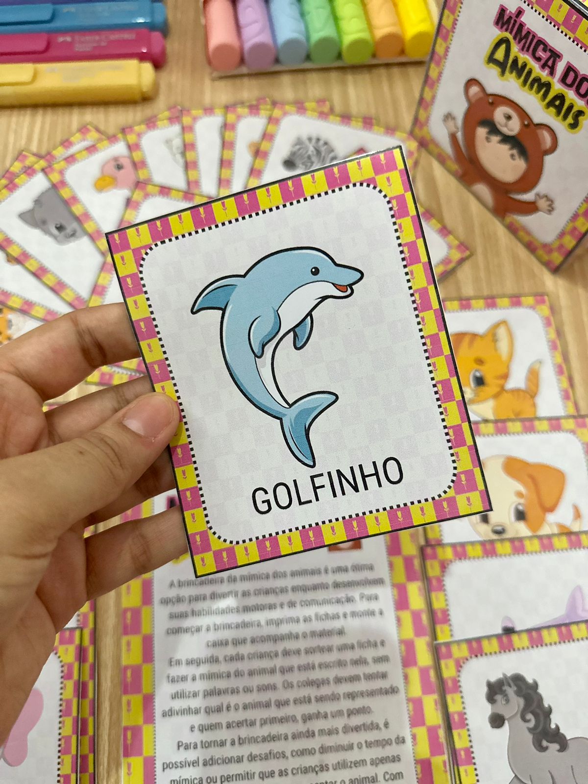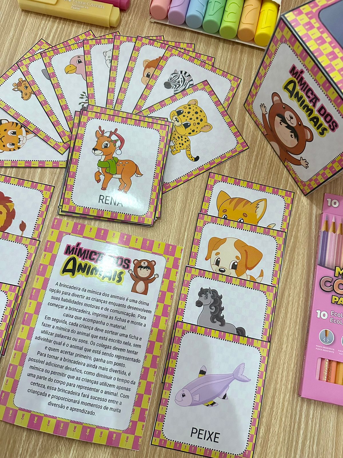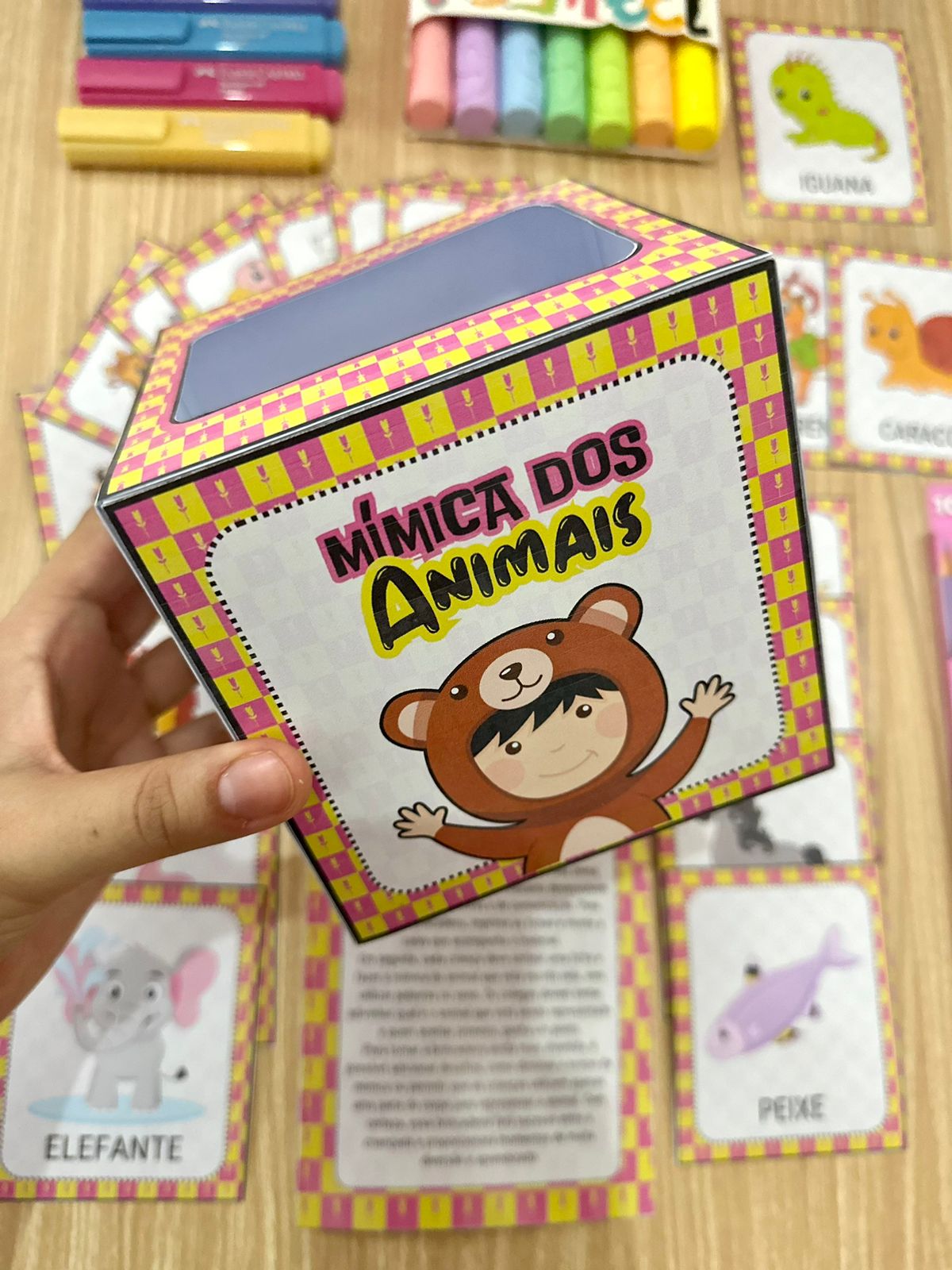 A brincadeira da mímica dos animais é uma ótima opção para divertir as crianças enquanto desenvolvem suas habilidades motoras e de comunicação. Para começar a brincadeira, imprima as fichas e monte a caixa que acompanha o material. Em seguida, cada criança deve sortear uma ficha e fazer a mímica do animal que está escrito nela, sem utilizar palavras ou sons.