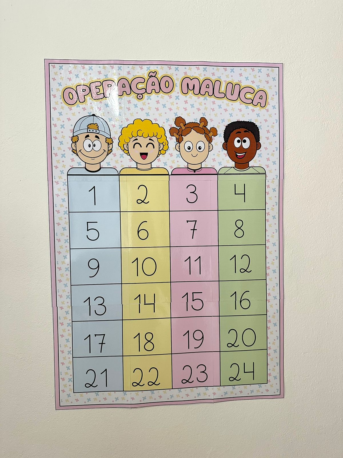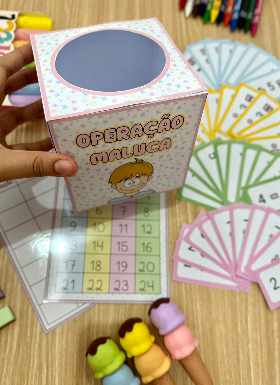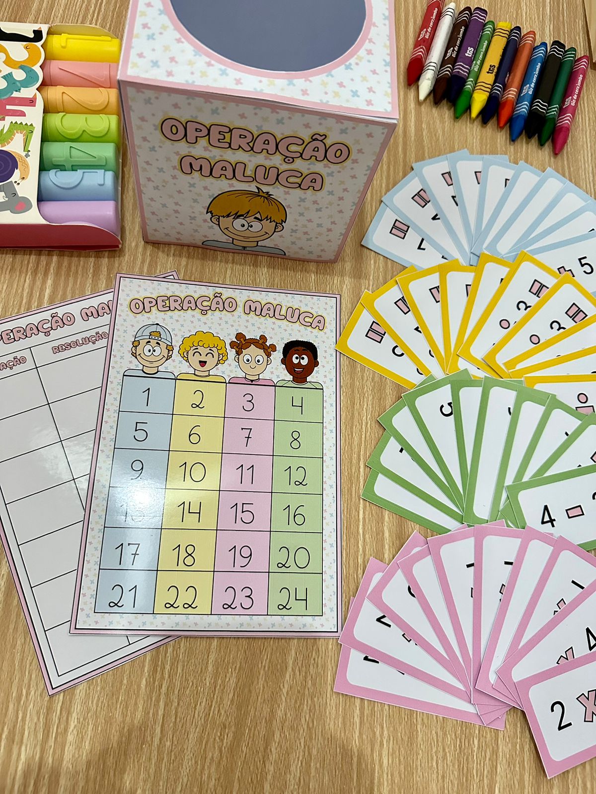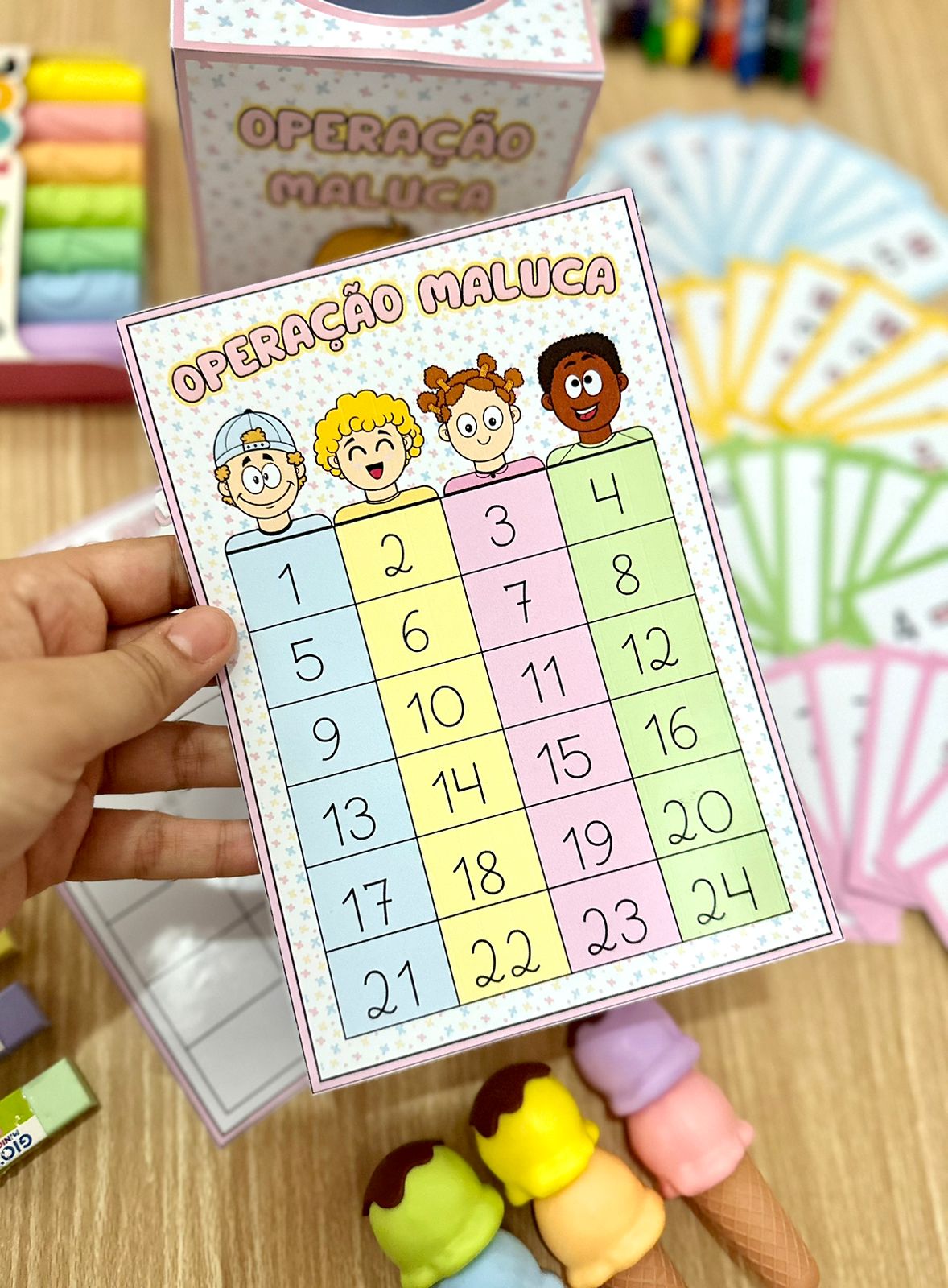 O arquivo acompanha um cartaz numérico de 1 a 24 já ampliado, folha para o registro das resoluções e uma caixinha para a criança sortear o exercício.