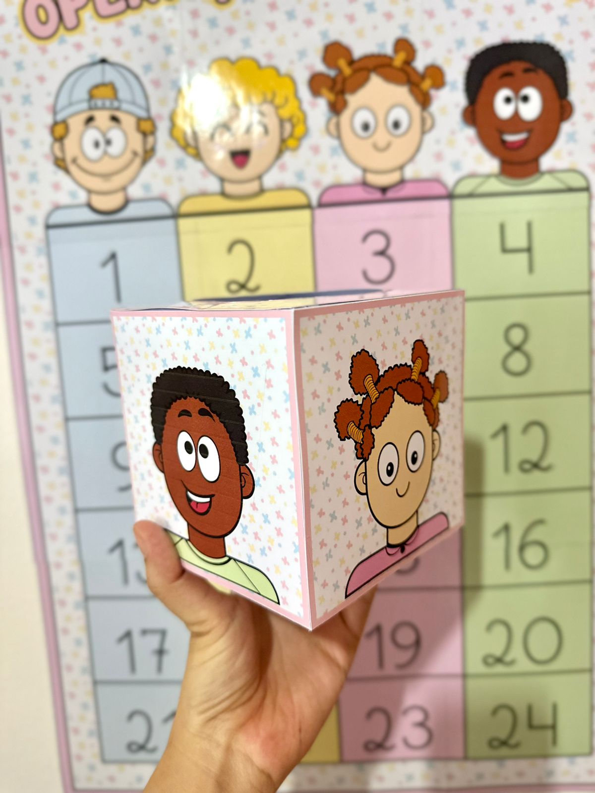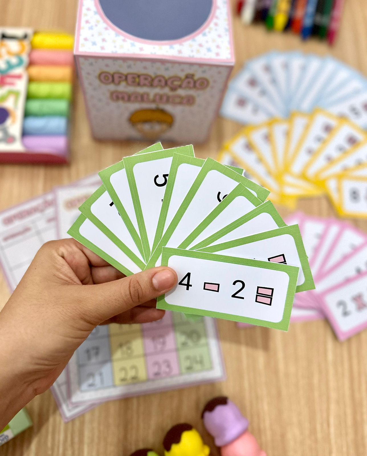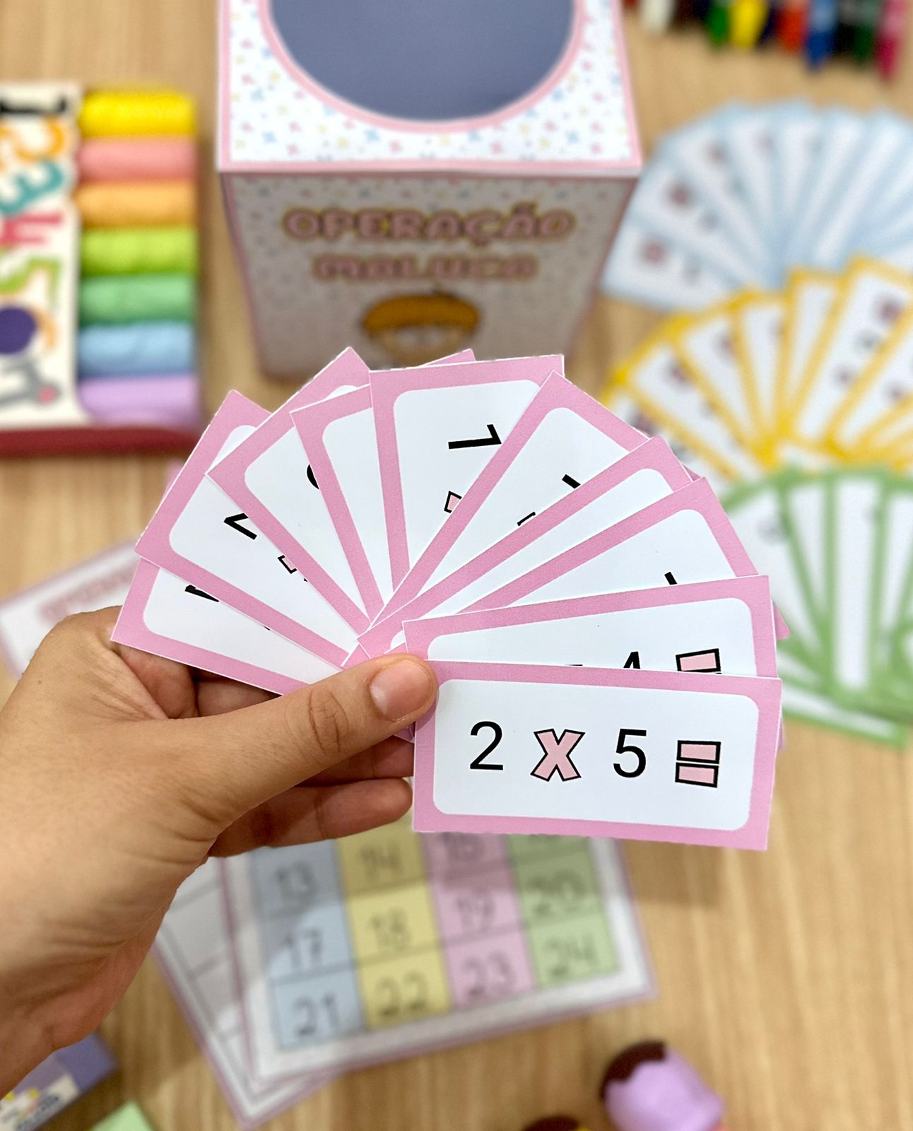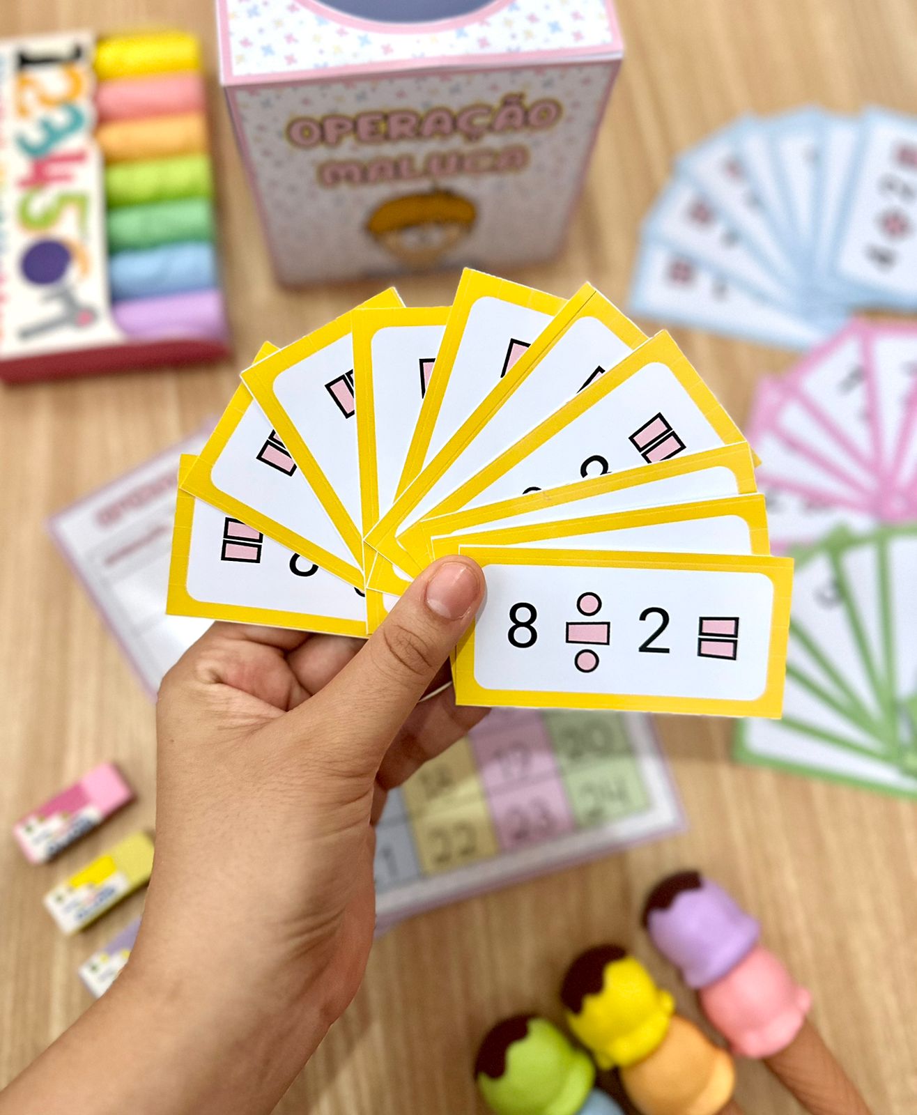 O arquivo acompanha um cartaz numérico de 1 a 24 já ampliado, folha para o registro das resoluções e uma caixinha para a criança sortear o exercício.