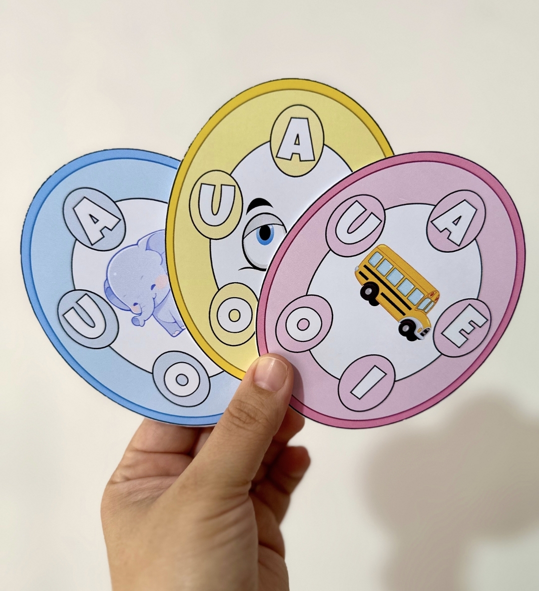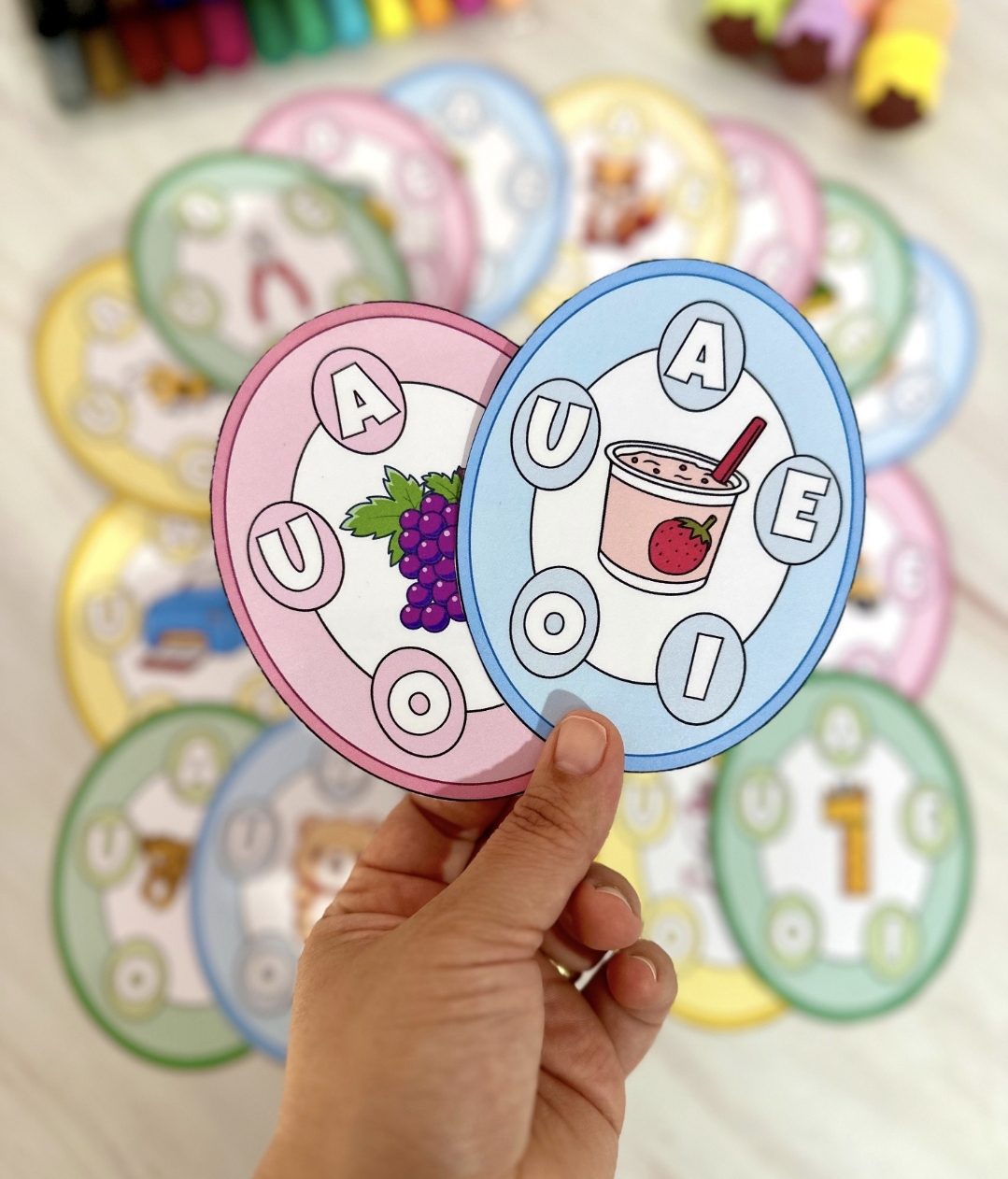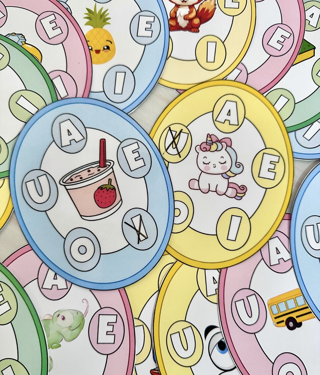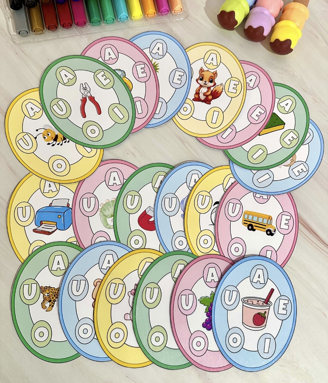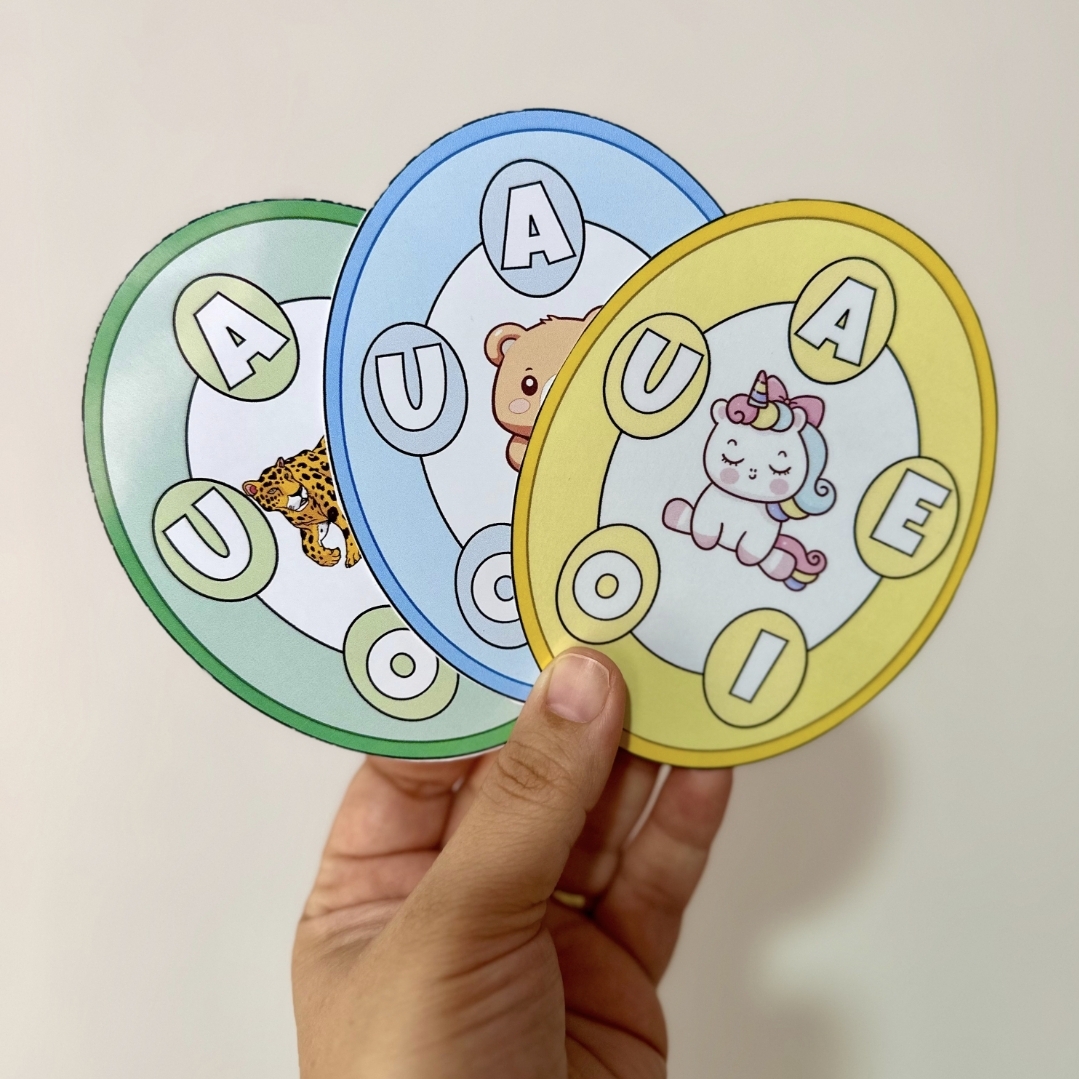 O material vai em PDF pronto para impressão, e inclui 20 fichas. Este recurso utiliza uma abordagem visual e interativa para facilitar o aprendizado das vogais de maneira acessível e envolvente.