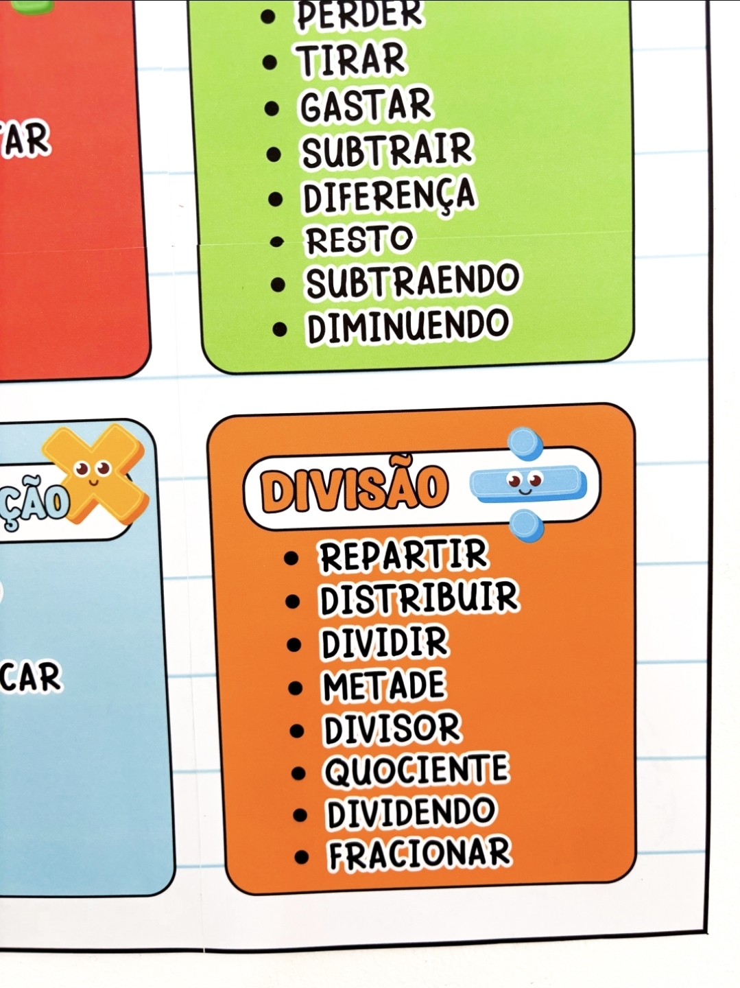 Esse cartaz de termos matemáticos das 4 operações é aquele apoio visual que faz diferença no dia a dia da sala. Dividido em 4 folhas A4 ele ajuda o aluno a compreender, relacionar e usar os termos certos na hora de resolver as atividades.