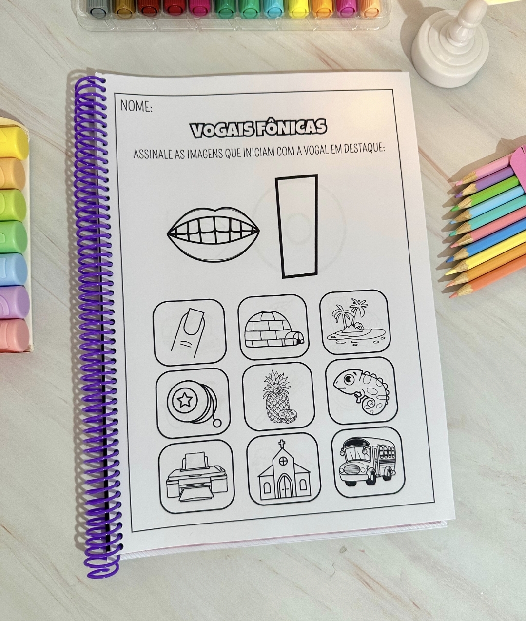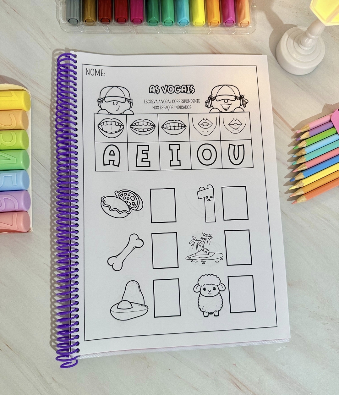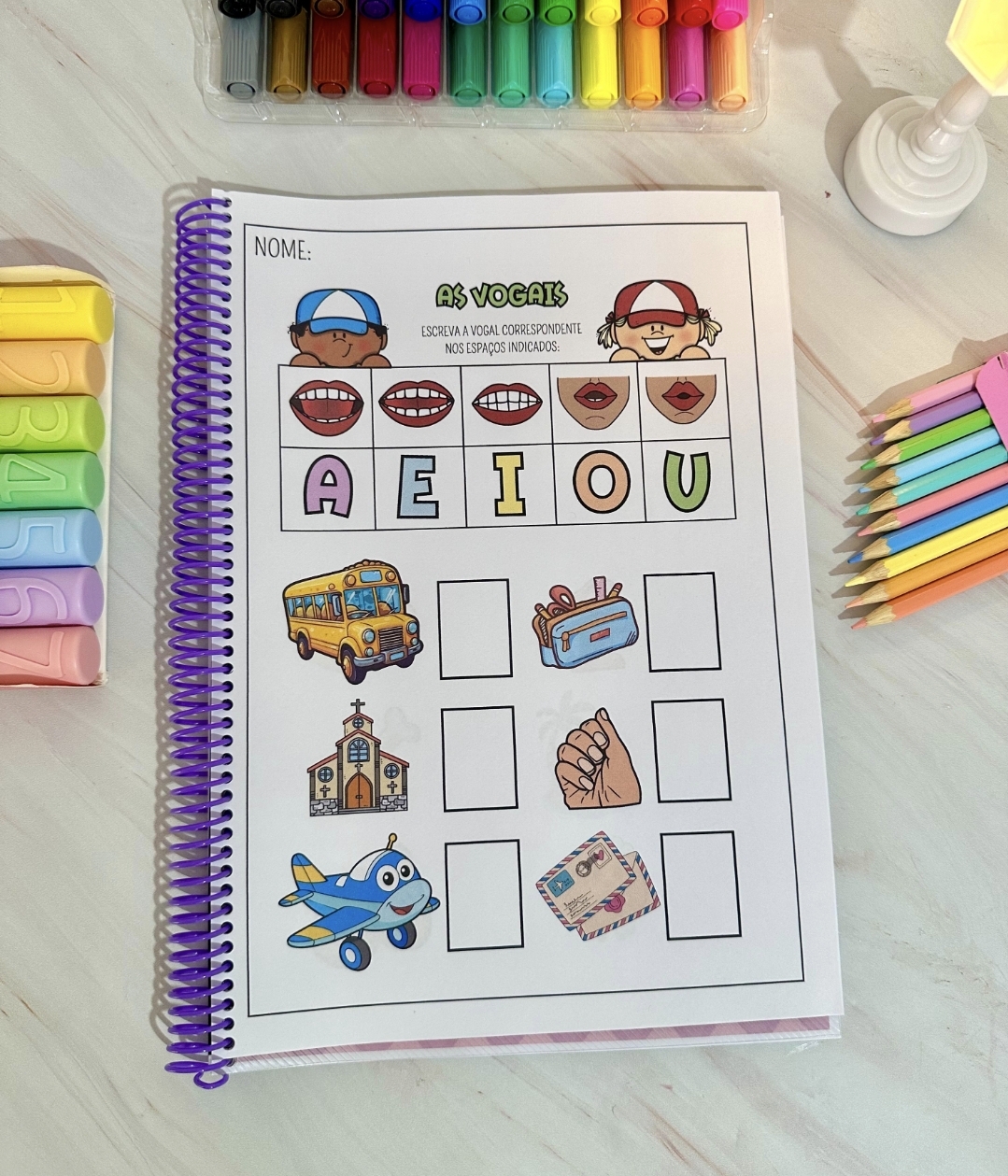 A apostila contém 34 páginas com imagens e as boquinhas ensinando o som de cada letra correspondente à imagem.