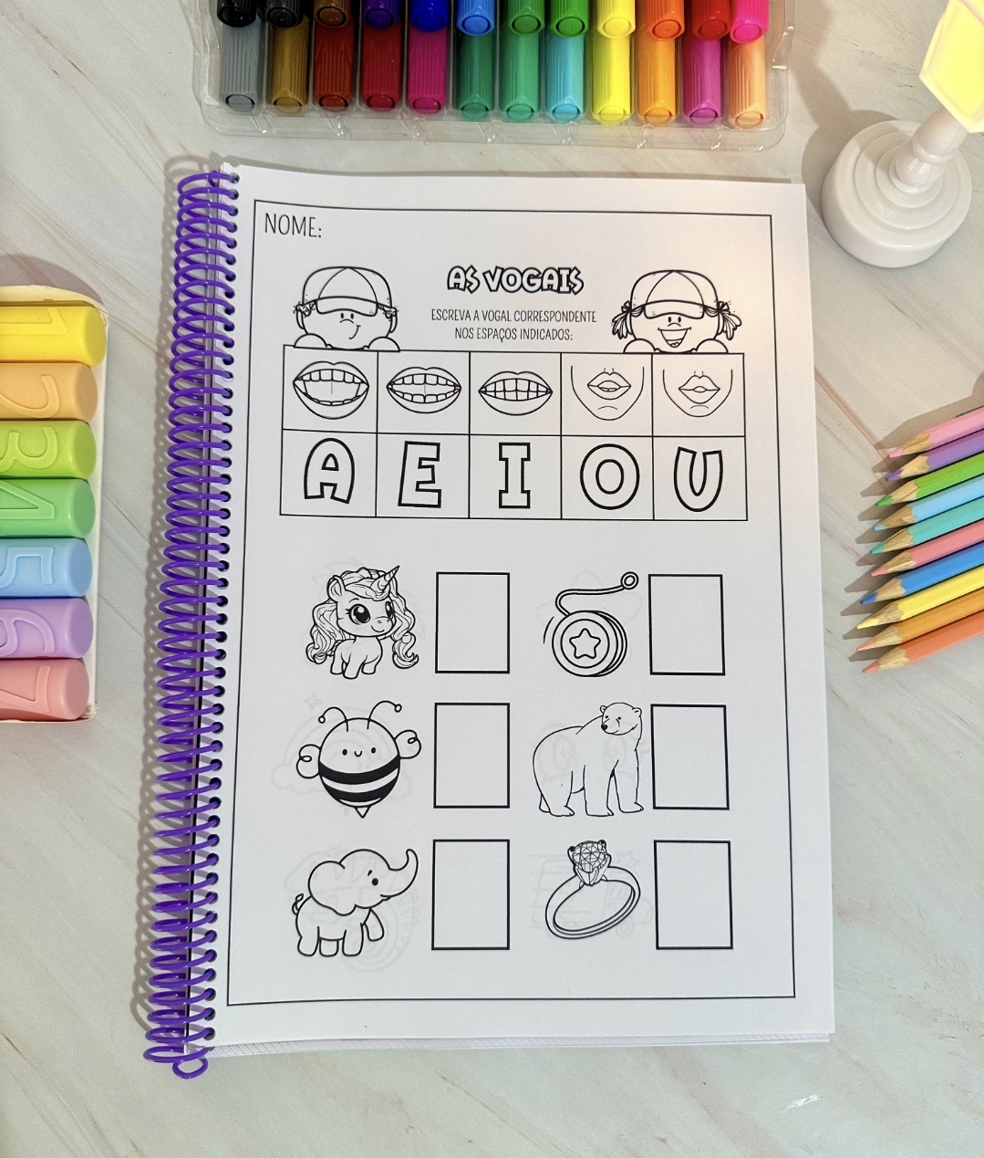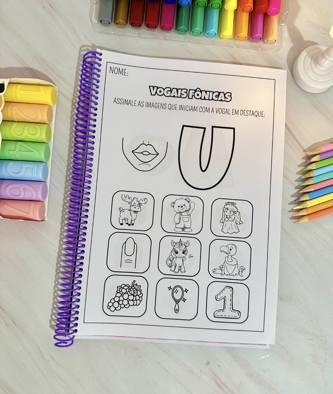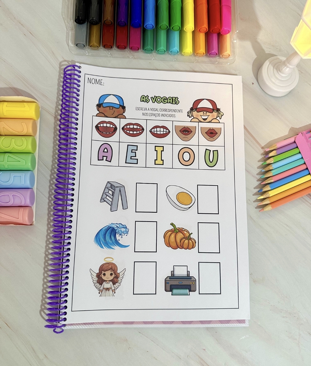 A apostila contém 34 páginas com imagens e as boquinhas ensinando o som de cada letra correspondente à imagem.